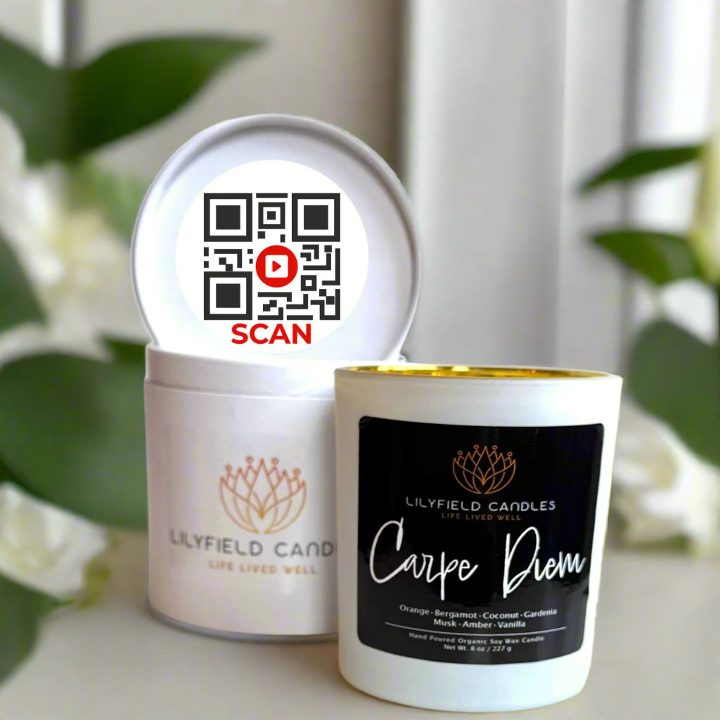 Seize the day with Carpe Diem! This candle is accompanied with a QR code linked to a unique and inspirational message about Carpe Diem. This soy, non-toxic candle smells like vanilla and gardenia with top notes of bergamot. Carpe Diem is a light scented candle that creates a wonderfully dreamy atmosphere for a Life Lived Well.