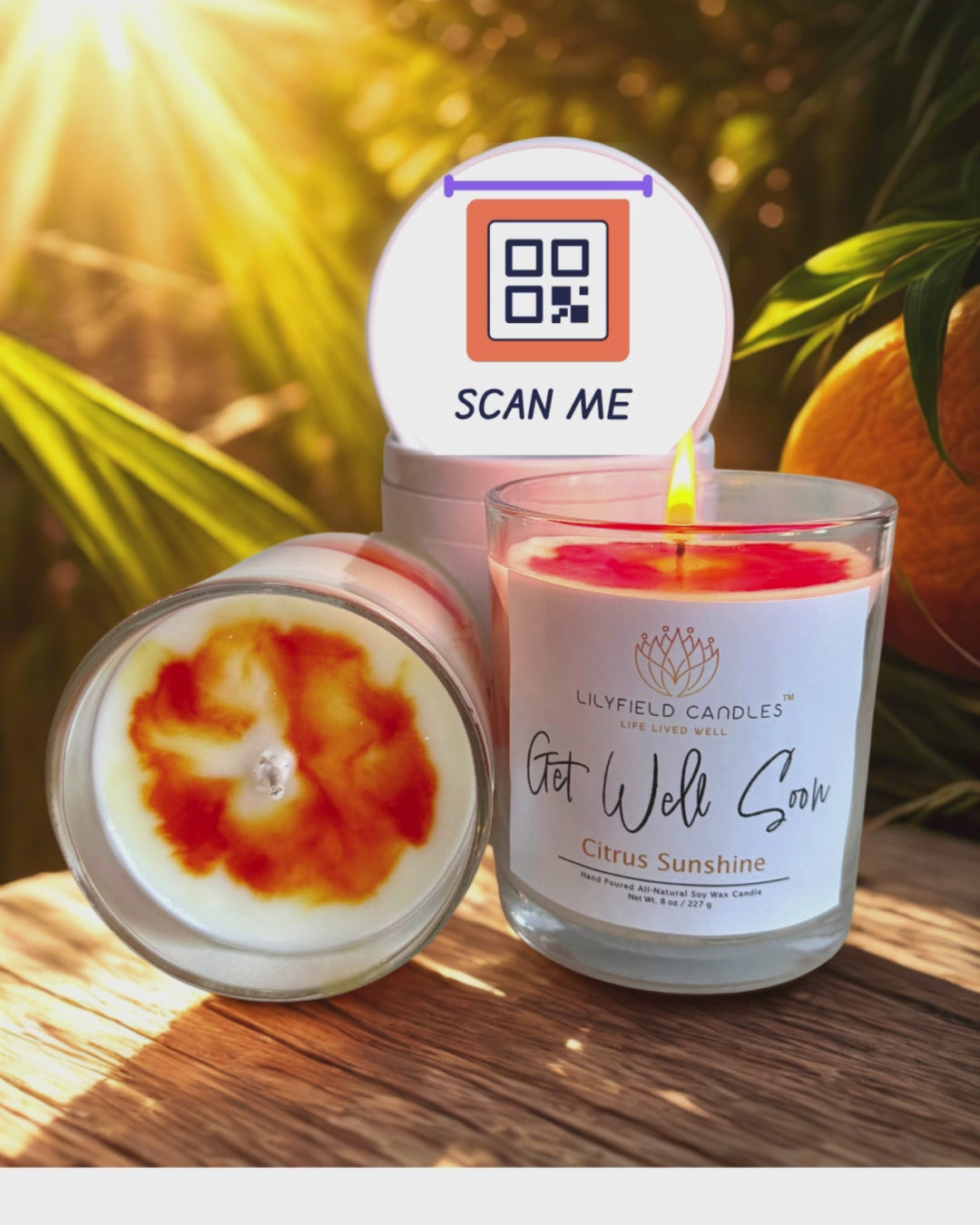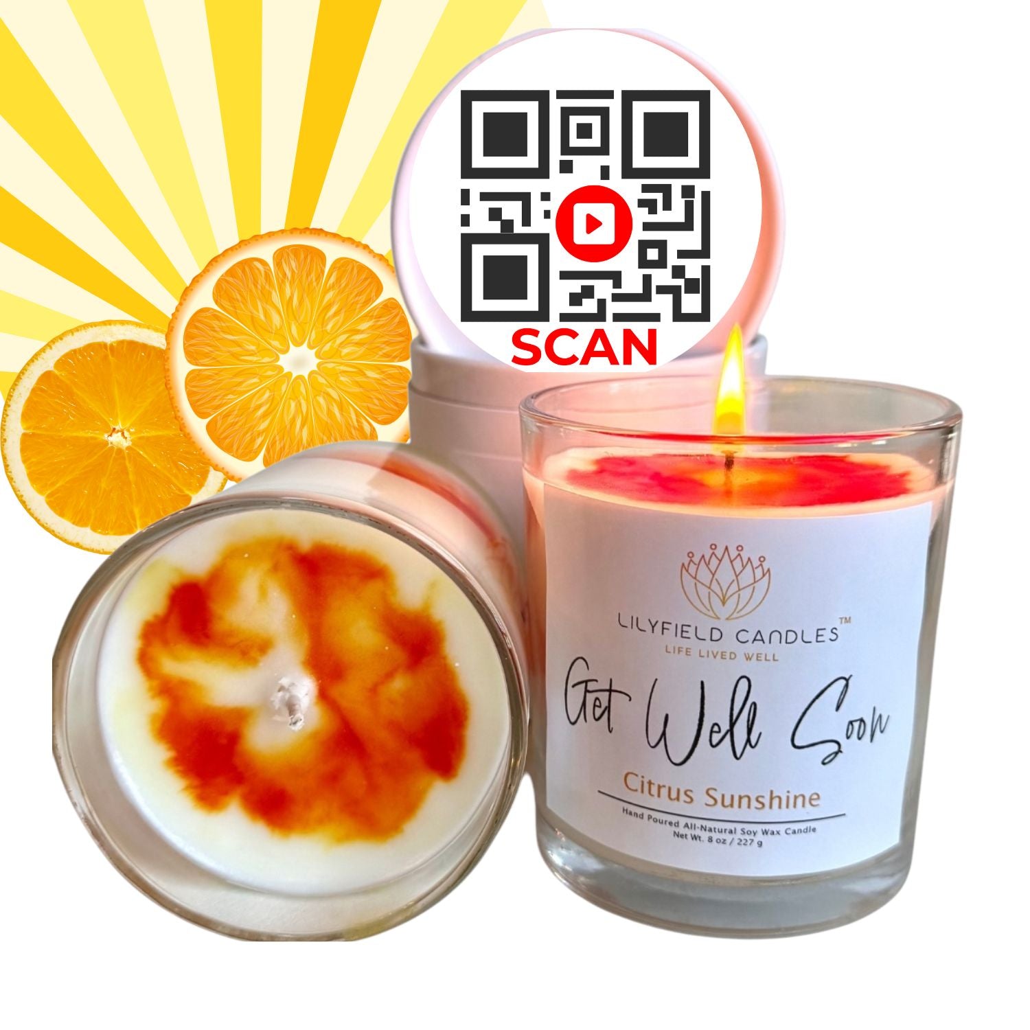 Get Well Soon is a radiant burst of citrus and sunshine, designed to uplift the spirit and brighten any space. Its crisp, refreshing notes bring a sense of warmth and renewal, like the first rays of morning light. This invigorating fragrance and the short inspirational video are a gentle reminder of hope, healing, and the power of positivity. Here's to creating a Life Lived Well.